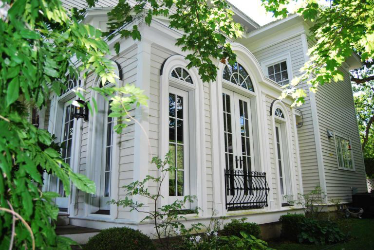Light washes the space through French doors, transoms and a semi-circular lantern above while providing sanctuary in a garden setting. Interior and exterior trim details help to blend this addition into the already exquisitely detailed home.